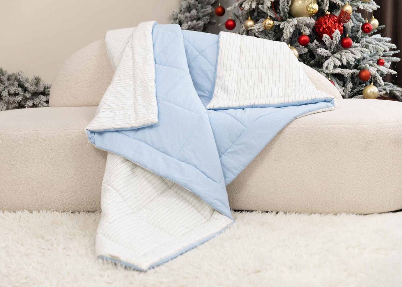 Одеяло из вареного хлопка, голубой меланж + белый в полоску